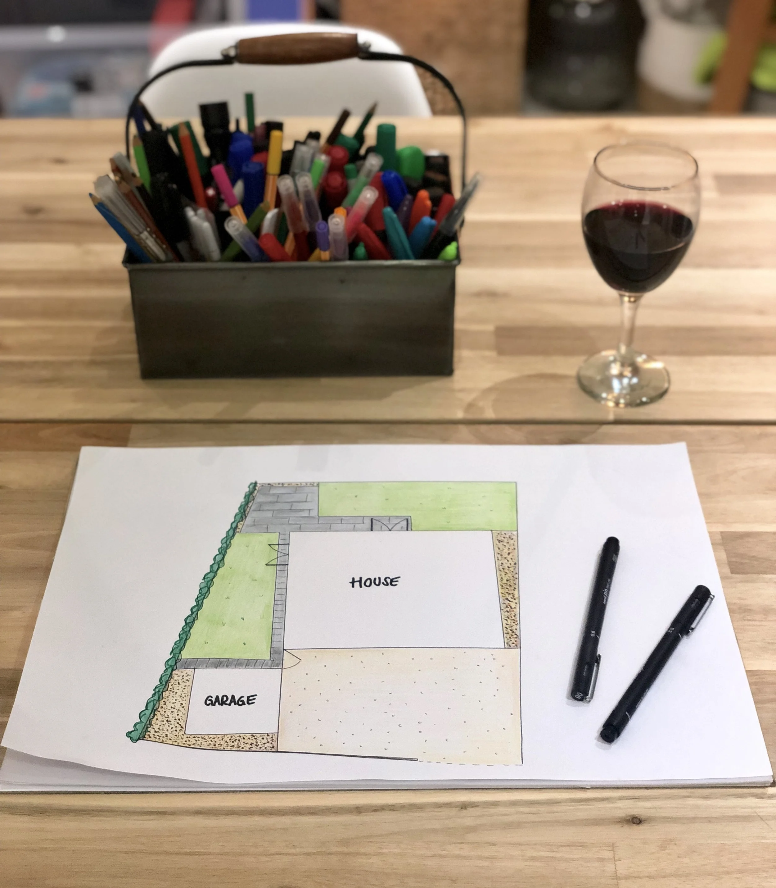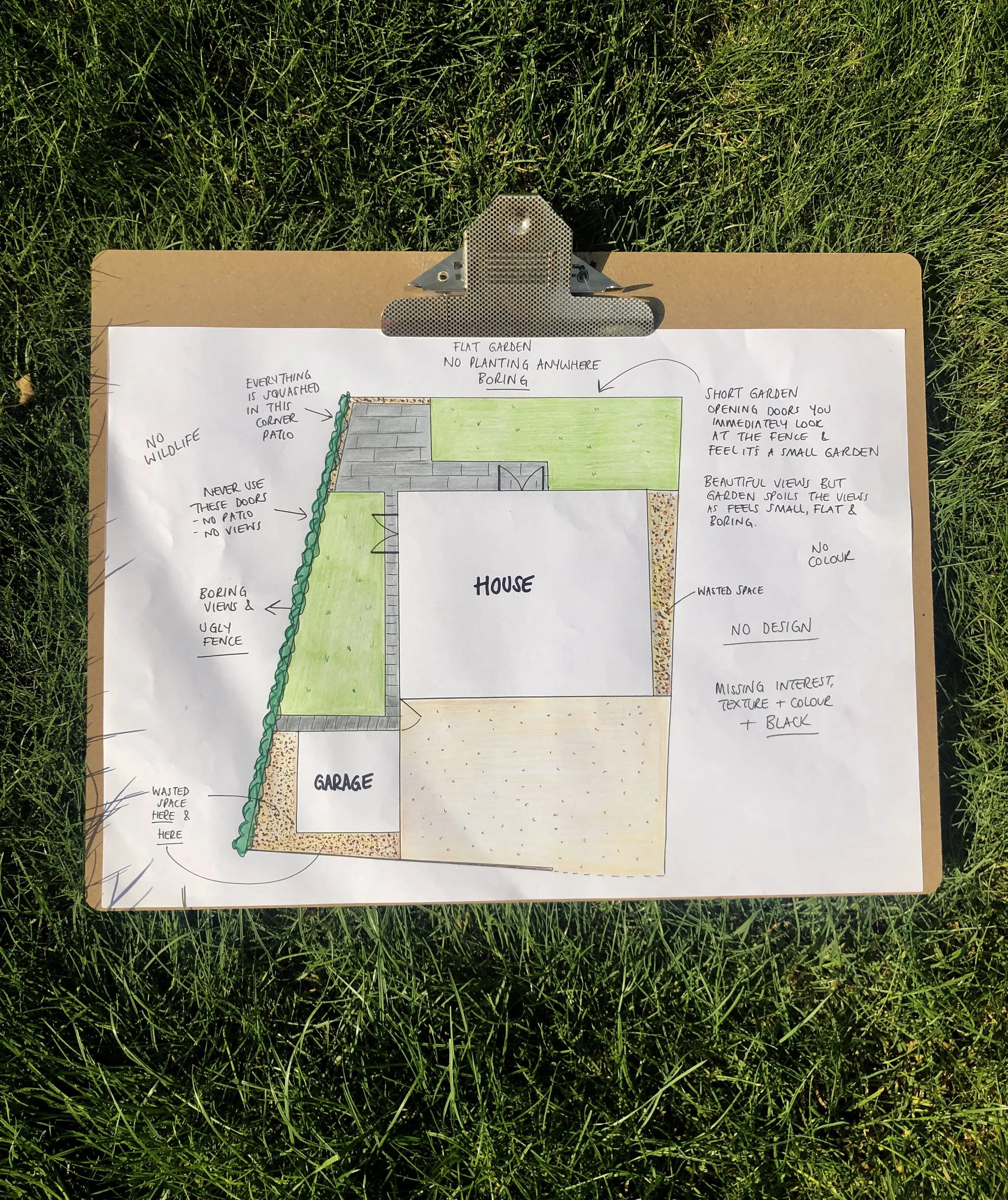 It helped me to complete a scaled site plan of our garden before we started any work. Admittedly I got carried away colouring in the grass and paving, but it was the best ‘BEFORE’ shot I was ever going to get that joined together the three separate areas of the garden to help me see the entire space and start work.